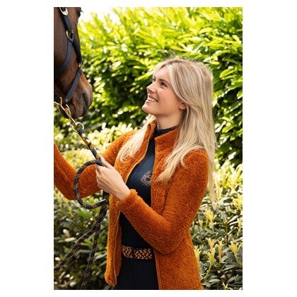 Zacht coralfleece vest waarin subtiel een glitter draadje is meegeweven, twee zakken met ritssluiting en met een opstaande kraag.