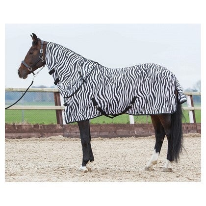 Vliegendeken met afneembare hals en zebraprint. De hals en de deken zijn eenvoudig en snel te sluiten door clipsluitingen. Inclusief kruissingels en bilkoorden.