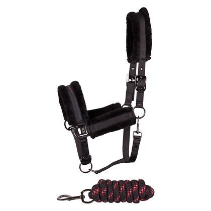 Halsterset met Equestrian Society logo op de neus, met zacht kunstbont onderlegd, verstelbaar aan twee kanten van het kopstuk en op de neus, inclusief een halstertouw van 2 meter lengte.