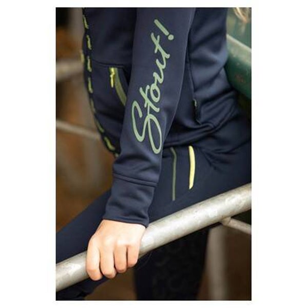 Vest met tweeweg ritssluiting met daarnaast een sierbies met het STOUT! Logo, twee zakken met ritssluiting en een contrasterende piping en het STOUT! logo op de mouw en op de rug.