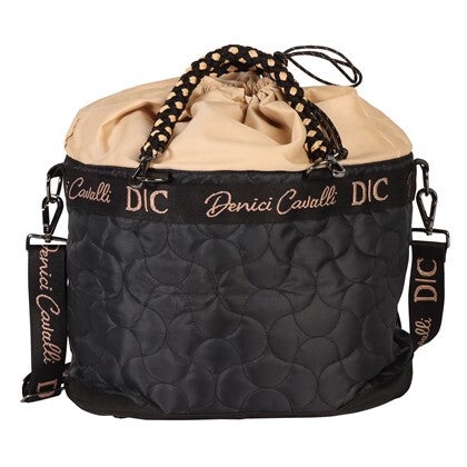 Poetstas met allover quilt, Denici Cavalli logo met kristallen, webbing rondom met het Denici Cavalli logo, een contrasterende bovenzijde afsluitbaar met een tweekleurig trekkoord, twee opbergvakken aan de buitenkant, verstelbare schouderband met het Denici Cavalli logo en kunststof noppen aan de onderkant.