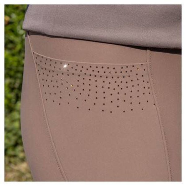 Zeer dunne softshell rijlegging met een hoge tailleband en rondom met riemlussen die extra zijn doorgestikt Twee zakken rijkelijk voorzien van kristallen en waarvan een met het chique EQS logo, rondgenaaid zitvlak met een siliconenprint met bitjes en een comfortabele elastische inzet rond de enkels. Ideale zomerrijbroek.
